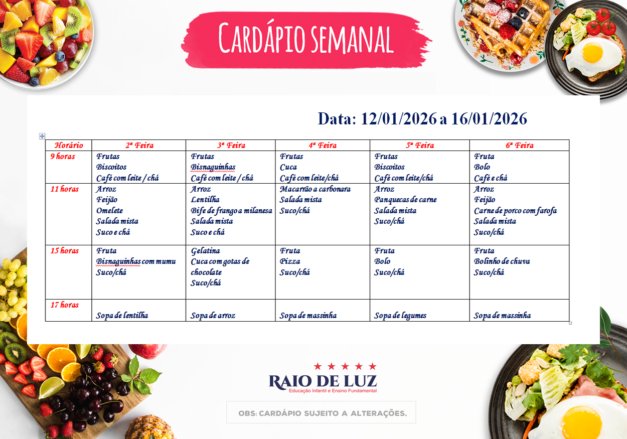 OBS: ** Arroz e feijão ou arroz e lentilha – todos os dias